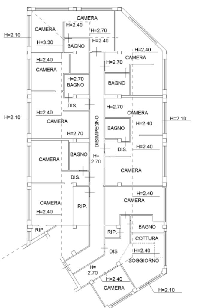 -piano primo: sono presenti appartamenti di varie metrature nello specifico sei bilocali con zona angolo cottura, camera e bagno. E' presente un appartamento di 145 mq composto da sala cucina, due camere con cabina armadio privata, bagno e zona lavanderia.
