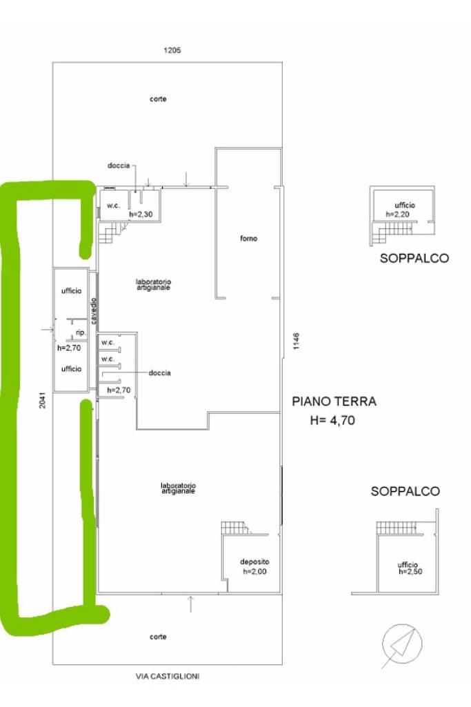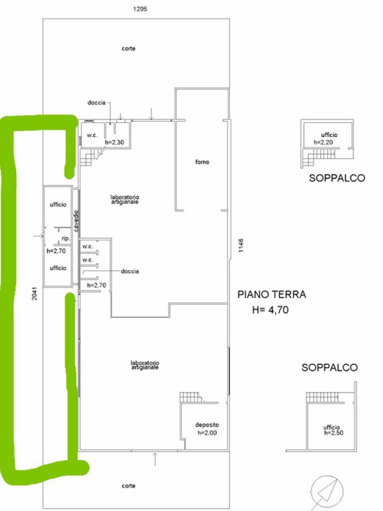 La corte disposta su circa 300mq comprende un box ufficio avente un altezza di 2,7 metri ed è disposto di ripostiglio e wc.